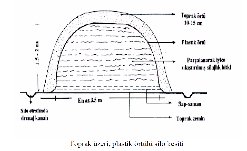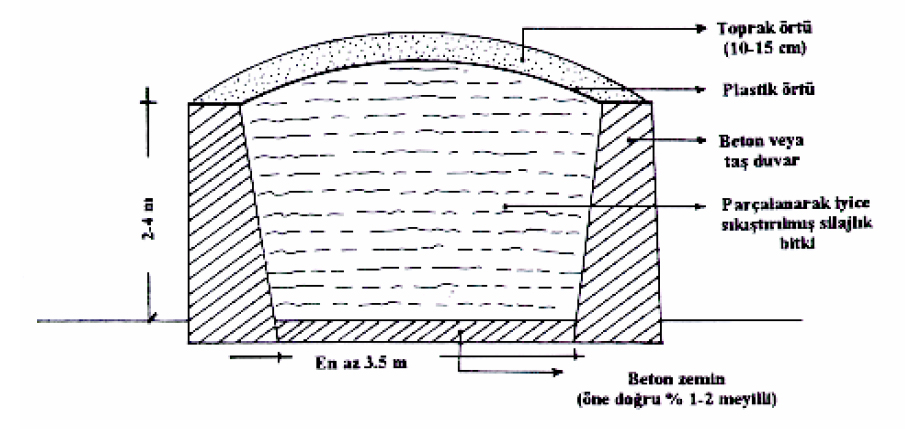 Silaj yeri %1-2 eğim olmalı, yer toprak ise merdane ile sıkıştırılmalı, taşlar vs temizlenmelidir. Silo genişliği 4-6 m, uzunluğu 10-15 m, yüksekliği 1-2 m olmalıdır. 1 m2' de 600-1000 kg yem depolanabilir. 5 dekar alandaki mısır için silo tabanına (400 mikron kalınlığında) plastik örtü (5 m x 15 m) serilir. 10-15 yerinden delinir ve üzerine 15-20 cm kalınlığında sap, saman serilir. Kıyılan materyal mümkün olan en kısa süre (2 gün) içerisinde siloya doldurulup, kapatılmalıdır. Bu süre zarfında siloya yağmur suyu girmemesine dikkat edilmelidir.